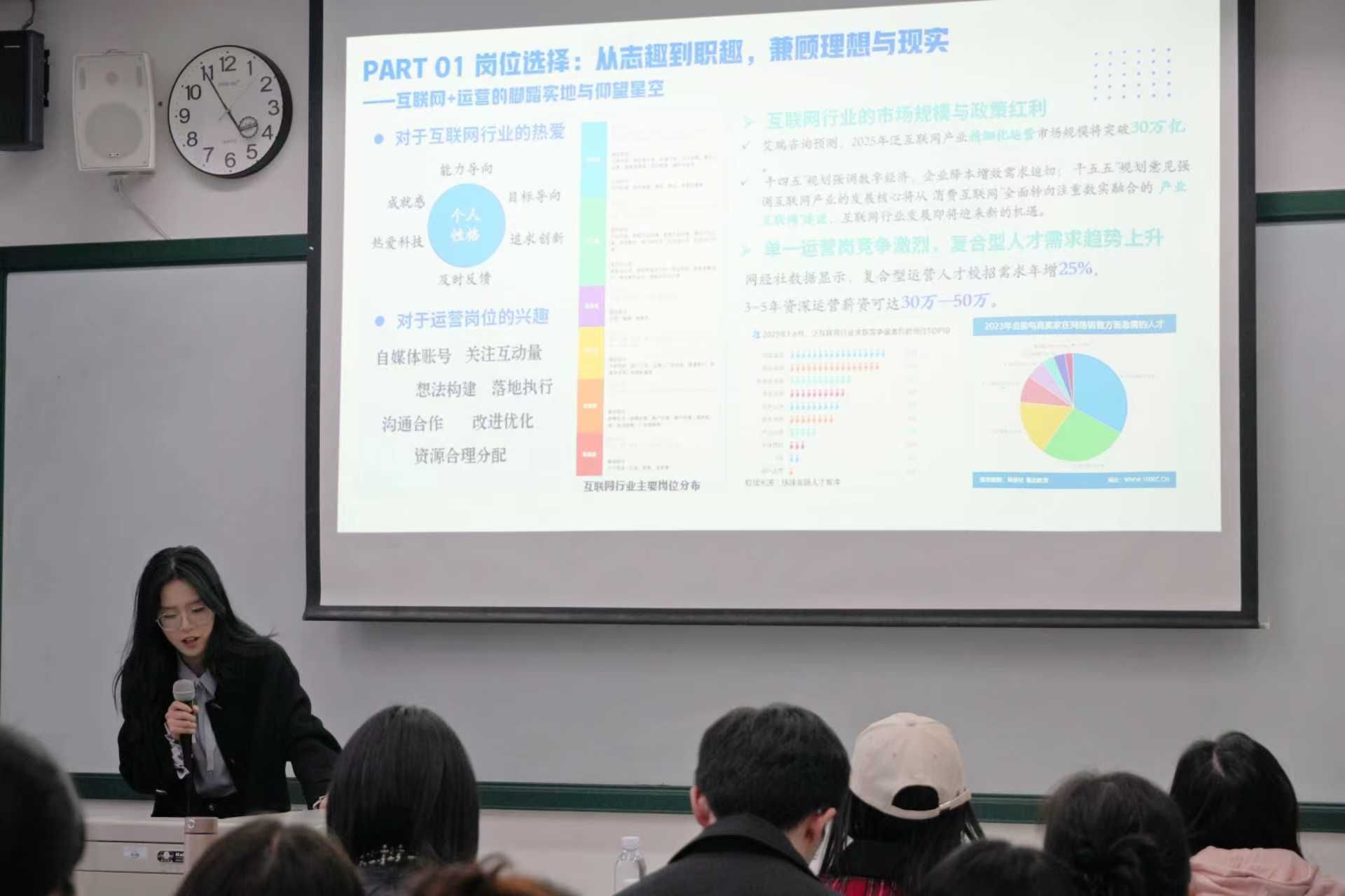 经过学生自主提交参赛简历、学院初审等环节,8名选手从75份简历中脱颖而出进入决赛。选手们围绕教育背景、实习经历、技能优势与求职意向展开5分钟陈述,将个人特色与职业思考融入简历设计,展现出清晰的职业规划与扎实的综合素养。从项目经验的深入提炼到版式设计的视觉优化,从岗位匹配的逻辑陈述到现场表达的从容得体,每一份简历都凝聚了选手的深入思考与独特创意。现场气氛热烈,选手们自信沉稳的表现赢得了评委的充分肯定和观众的阵阵掌声。提问环节中,选手们针对职业发展路径与行业认知等问题进行回应,展现了良好的应变能力与专业素养。评委依据简历内容的完整性、设计的创新性、表达的逻辑性及岗位匹配度进行综合评分。