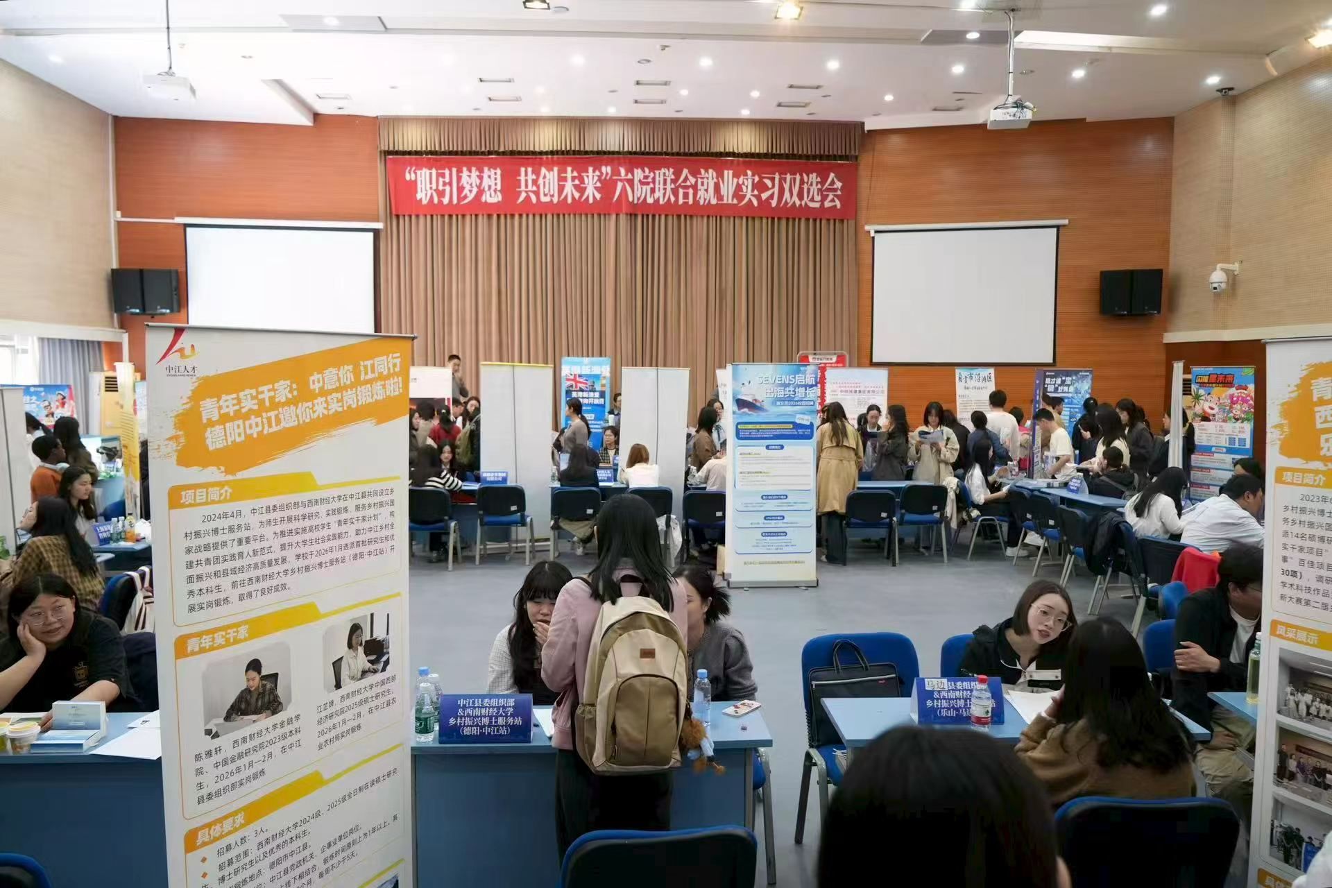 为深入学习贯彻党的二十大和二十届二中、三中、四中全会精神,全面落实党中央、国务院关于“以推动高质量发展为基础,以实施就业优先战略”的决策部署,抢抓2026年春季就业关键期与求职黄金窗口期,助力2026届毕业生实现高质量充分就业,4月14日下午,经济学院、统计与数据科学学院、国际商学院、经济与管理研究院、中国西部经济研究院、数学学院在学生活动中心多功能厅,联合举办“职引梦想 共创未来”就业实习双选会。