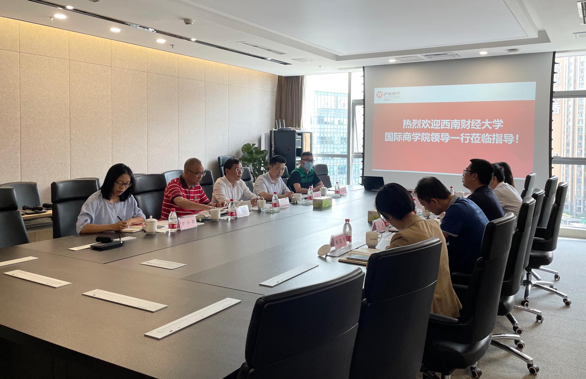泸州银行成都分行热情接待国际商学院一行。副行长王冲、副行长罗勇、金牛支行副行长蒲海林、国际业务部副总经理朱信宁、综合管理部经理陈新等主要管理人员参与座谈交流。王冲和罗勇详细介绍了泸州银行发展情况、用人要求及近年校园招聘。并特别感谢国际商学院一直输送优秀毕业学子到泸州银行,目前有15名国商学子,绝大部分都已成为业务骨干。张剑波介绍了学院的人才培养特色、专业设置以及毕业生总体情况,感谢泸州银行对国商学子的选用,也希望借本次机会进一步密切院企联系,加强有效合作。自由交流环节,双方就校园招聘、实习生计划、企业家进校园、课题合作等具体内容进行了深入沟通。
